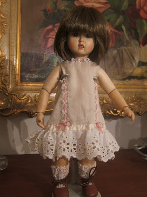 Bobbette wearing her eyelet trimmed slip with matching undies. February Challenge on the Bleuette Sewing Club on yahoo. All hand made with Swiss Nelona and old lace I had in my stash.